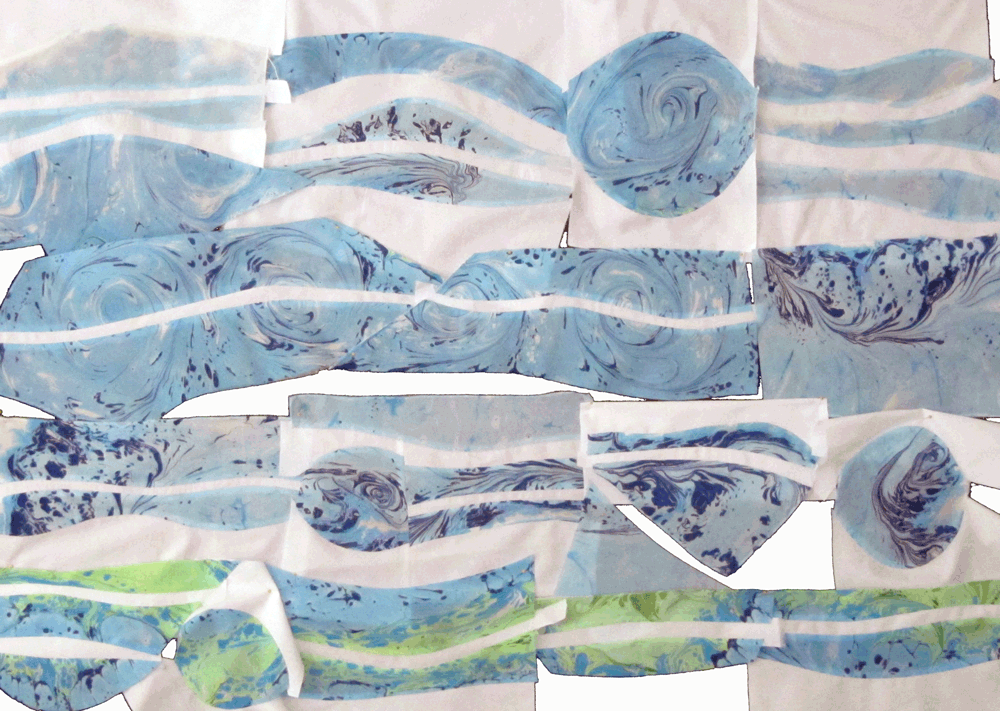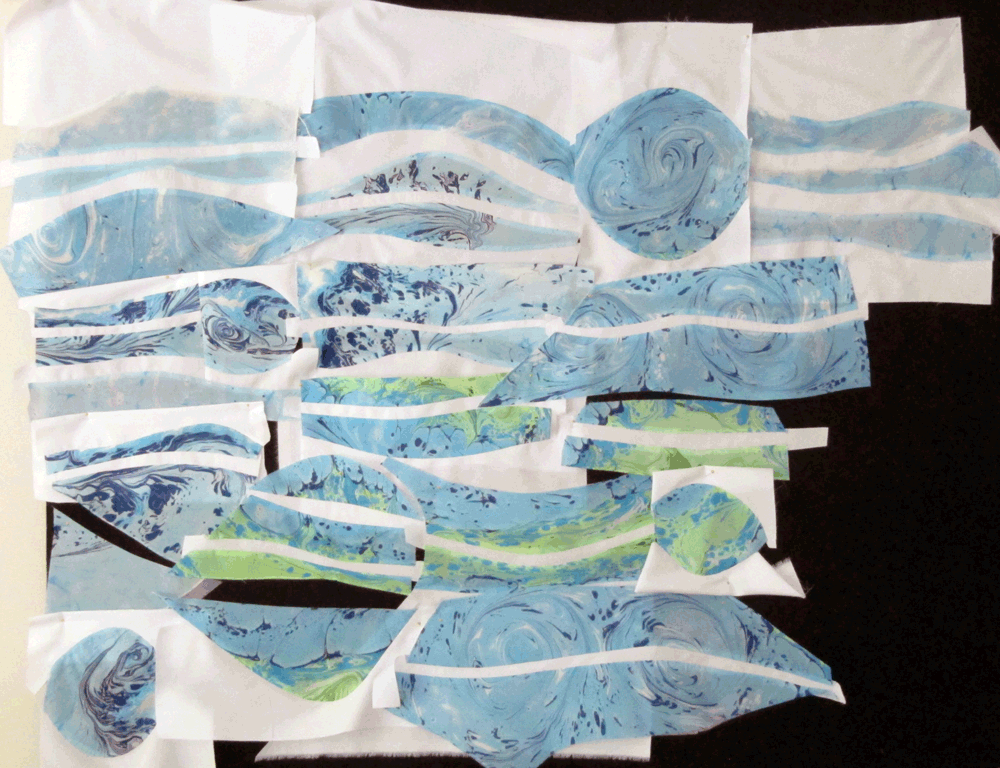 When I started making the quilt, I wanted to capture the feel of the waves, but I didn’t have much else in the way of a plan. Since the silk was very sheer, I first backed each scarf with a lightweight fusible interfacing. I chose to use plain white cotton fabric along with the marbled fabric so that the marbled fabric would be the star.