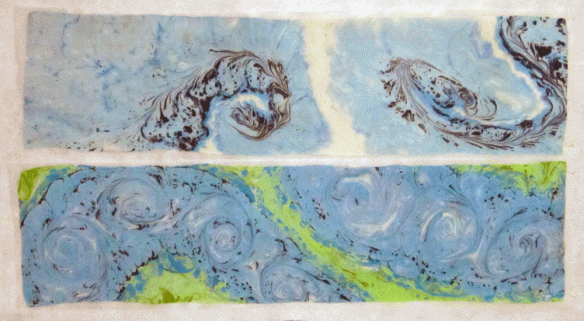 One day we went to see all the art galleries in Hanapepe and stumbled into The Art of Marbling Gallery which features marbled sarongs and scarves by Becky Wold and amazing wood bowls by Rob Bader. My husband, the woodworker, was captivated by the turned bowls while I loved the scarves. When Becky heard I was a quilter, she brought out a couple of scarf “seconds” which didn’t meet her standards. I bought them, knowing they’d make a great quilt with memories of Kauai. Here are the scarves–they really remind me of the waves in Kauai.