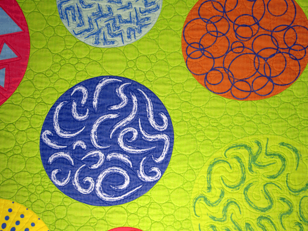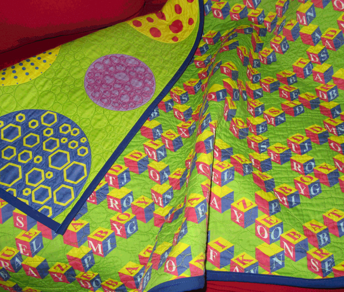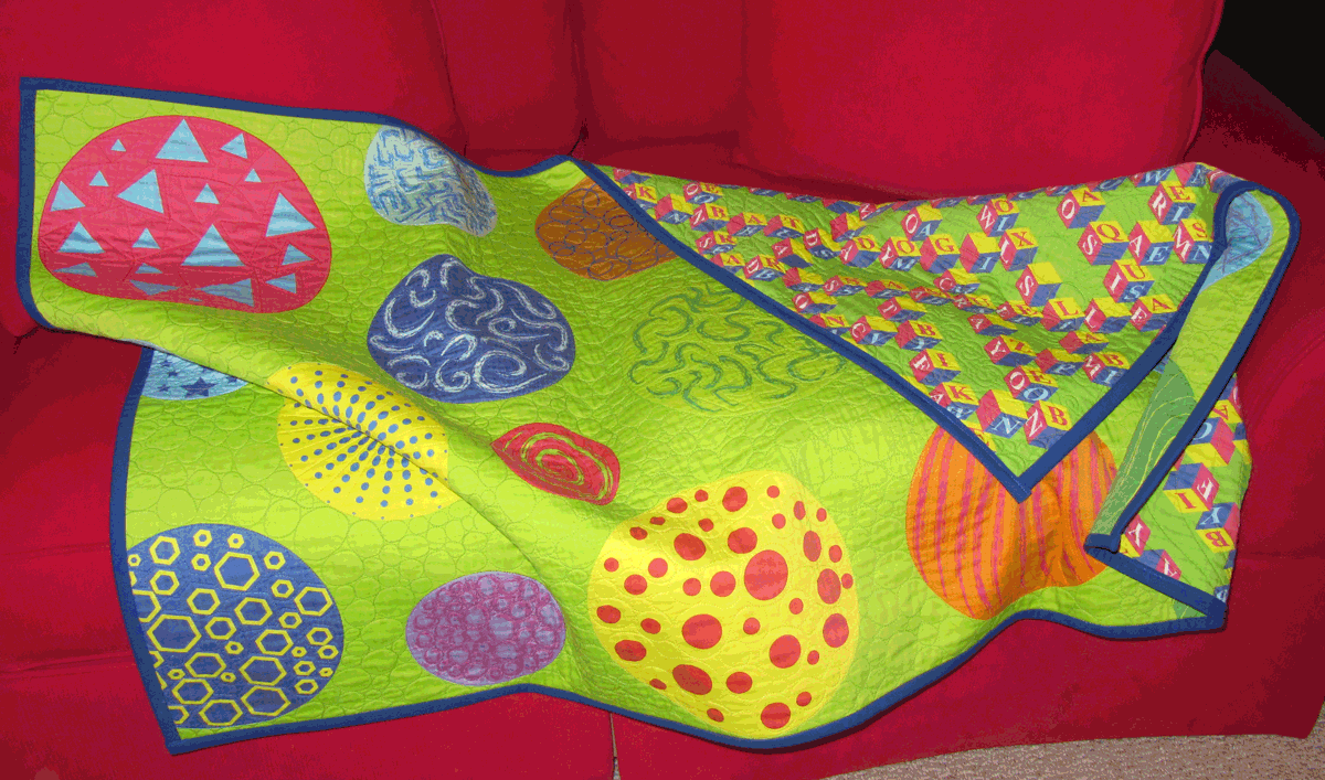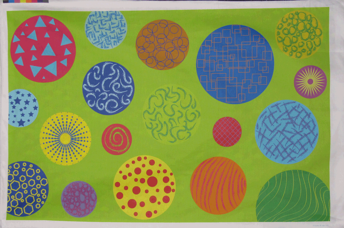 I wanted a coordinating fabric for the other side of the quilt, so I drew some fun circles and used the same lime green for the background. I designed both fabrics using Adobe Illustrator which gave me the flexibility so size them to fit the fabric.