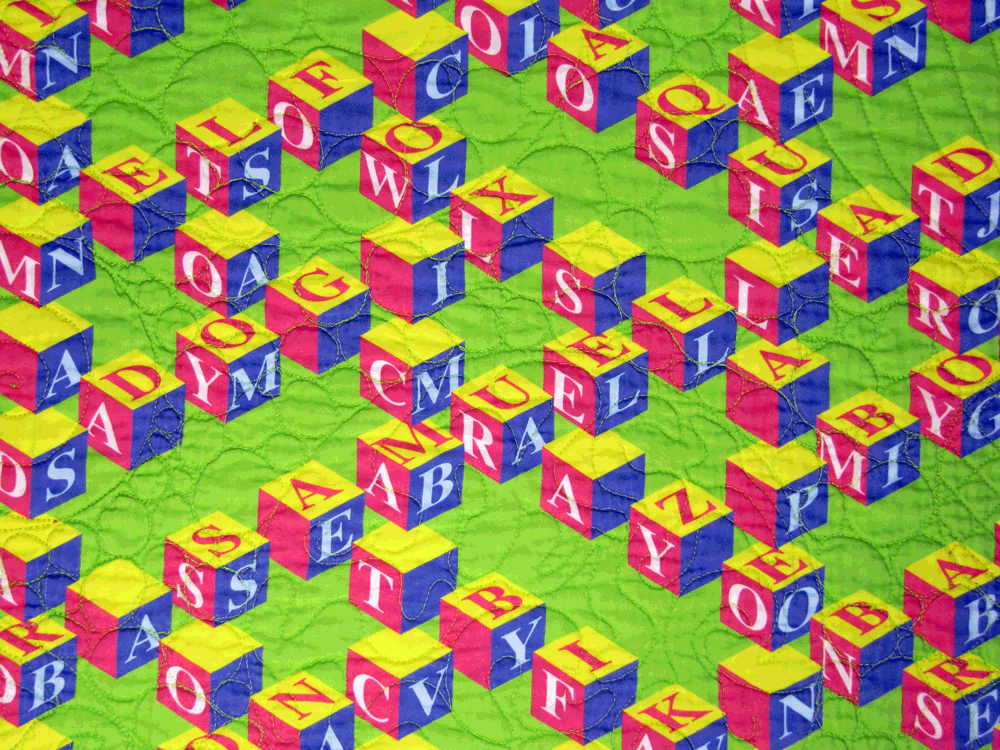 Some friends had a baby recently and I knew it was a great excuse to make a quilt. I’d created a fabric design of interlocking blocks which could be personalized with the baby’s name, so I used that–Samuel Addison–as well as other words with significance to the parents, like Hoosier, baseball, Sox and clown, in creating the fabric design.