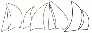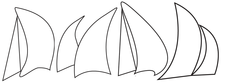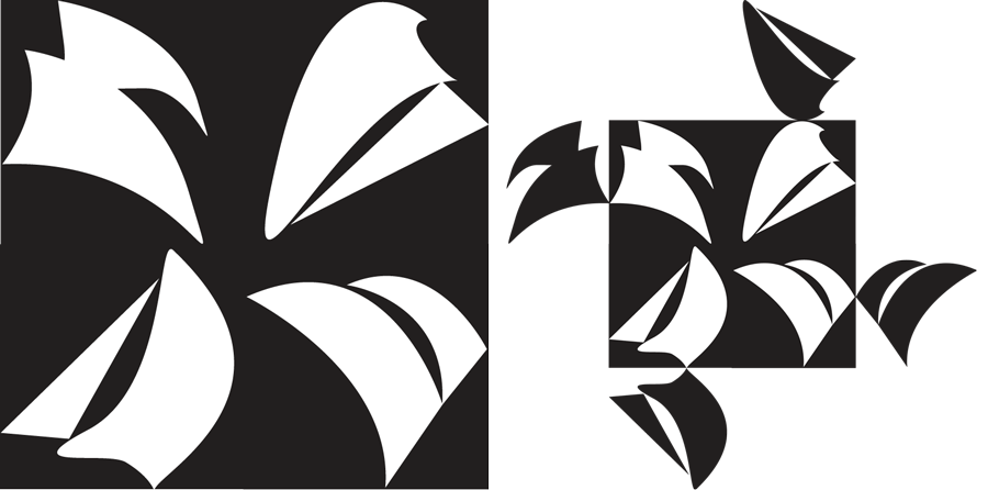 I started with these four drawings of sails that I’d done earlier. I played around with arranging these in a square where part of each sail touched one or two sides of the square. I settled on the version on the left below. When the sail shapes are “folded” back, it creates the image on the right.