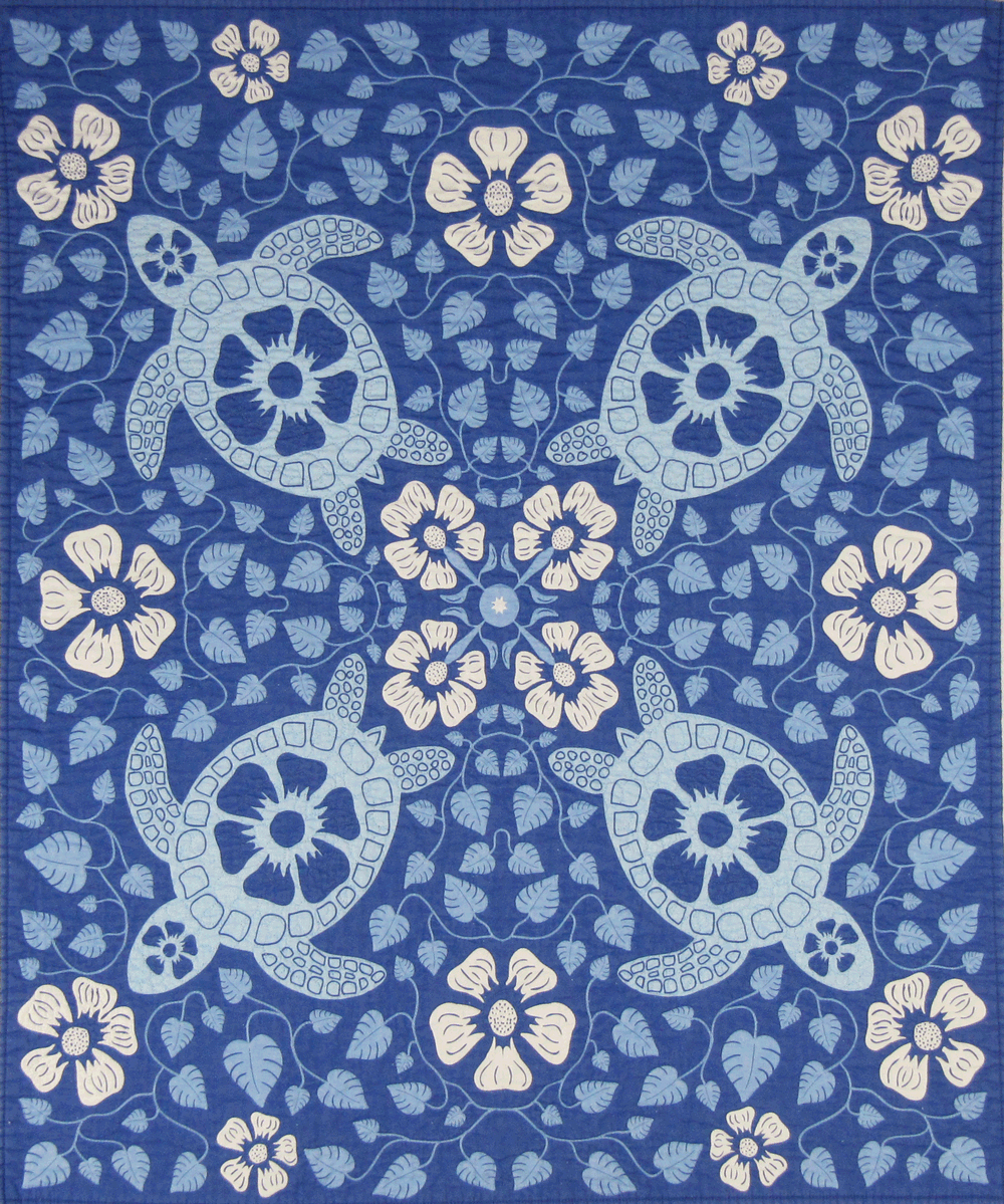 For quilting the large version, I wanted to keep the quilting fairly simple (and quick–it’s going in my bathroom after all). Using “invisible” polyester monofilament thread. I outlined the flowers and leaves and quilted the turtles using a pebble stitch mimicking the design on the turtles. I did all the quilting and finished the edges in an afternoon. I like the wrinkled look that comes after washing a quilt, so I threw it in the washer and dryer for a quick spin.