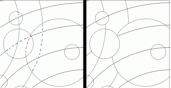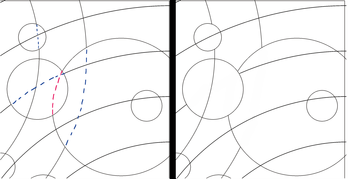 In the preliminary design (above) most of the Moons are bisected by arcs coming both from the upper left and the lower right. I wanted to simplify the design, so for each Moon I picked one direction for its arcs and then deleted any arcs inside that Moon from the other direction. Shown below is the upper right corner of the design. On the left are the deleted arcs shown by the dashed blue lines. On the right is the design after the arcs are removed. Also, anywhere Moons overlapped, I chose which Moon was in front and deleted the hidden portion of the background Moon (see the red dashed line below).