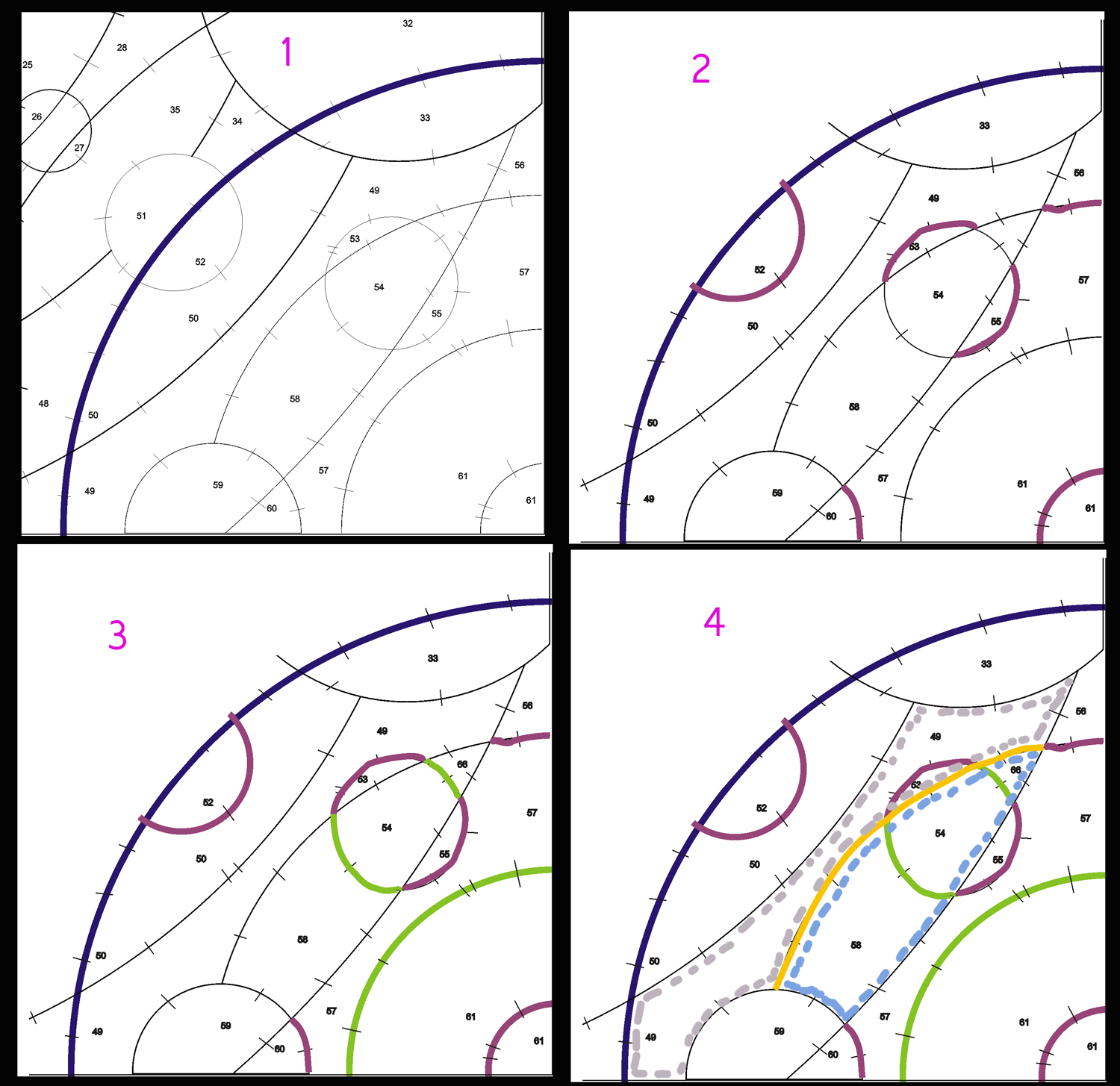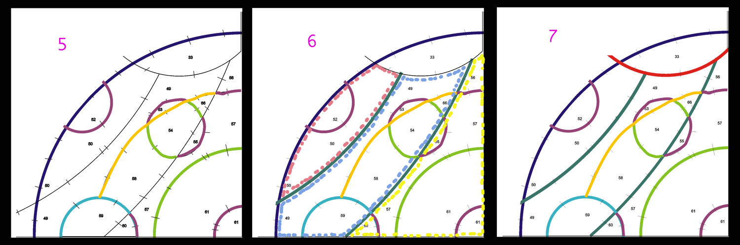 In step 2, the pink lines indicate seams that I can sew from beginning to end using only two of the design pieces. For example, I can sew piece 52 to piece 50. In step 3, the lime green lines show some additional seams to sew using two of the design pieces. Even though these are the same type of seams as in step 2, for me it’s easier to separate them so that it doesn’t look like I’m sewing the whole circle in one step.
