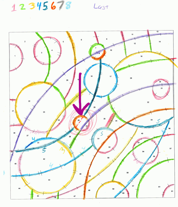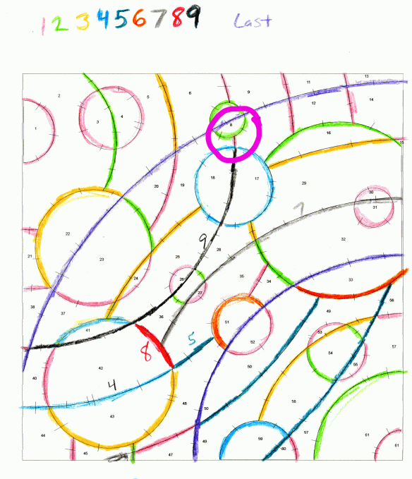 So that’s the process I follow. Shown below is my first pass at defining the piecing order for Moonstruck. Unfortunately, the small circle in the middle (pink arrow) caused me all sorts of problems with the piecing and Y-seams. I added one more seam (the dashed orange line) to eliminate the problem.