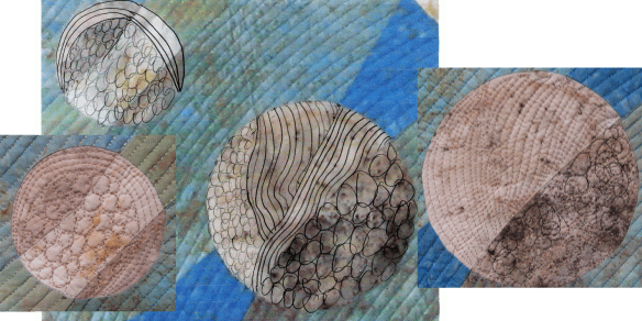 For the moons, I wanted to try to make each one unique. Before I started the actual quilting, I printed photos of some of the moons, and using a Zentangle-like approach, I sketched out possible designs. This helped me get a feel for quilting designs that would work.