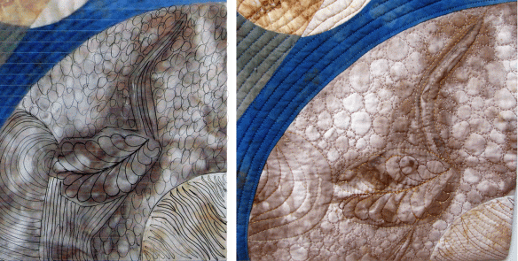 And one more close-up. For the quilting I used a variety of threads, but mostly heavier-weight polyester and rayon, some of it variegated. I used a bit of metallic thread in the largest moon, but it didn’t behave very well so I quickly abandoned it.