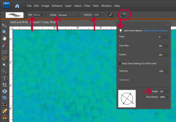 For the digital batik, I use Photoshop brushes for the resist effect rather than the traditional wax stamps.
