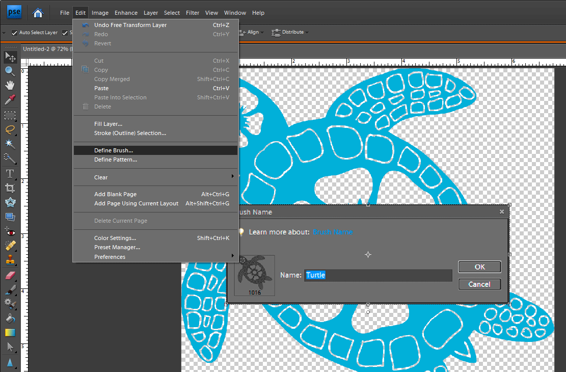 Creating a custom brush is quick in Photoshop. Open a new file in Photoshop and draw the shape you want to use for a stamp. For this example, I’m using the turtle design I created for this fabric design.