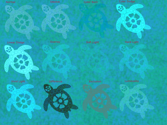 For creating a batik effect, the different painting mode options for the brushes are very useful. The different modes create very different effects. Below is an example of some of the brush painting modes. All of these were done using a light blue color for the brush, and the effects will be different using other color combinations.