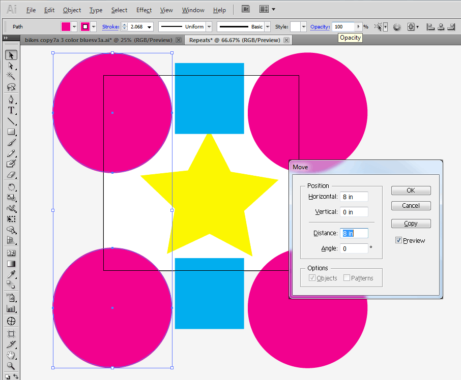 To copy the circles horizontally, select both pink circles and do the copy and paste in place as above. In the move pop-up box, make the horizontal position 8 inches and the vertical position 0 inches. This results in a pink circle in each corner of the artboard.