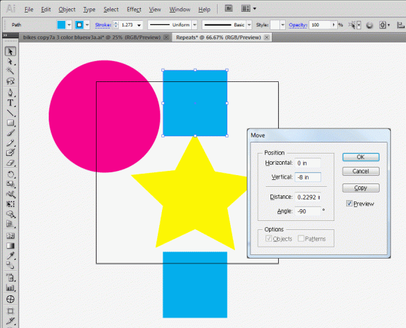 To move the new blue square to the top of the artboard, use the command Object ==> Transform ==>Move. In the pop-up box, check the Preview option so you can see where it’s moving. In this example the artboard is 8 inches by 8 inches, so I put 0 in the horizontal box and -8 in the vertical box. This moves the copy of the blue square from the bottom to the top of the artboard, as shown below.