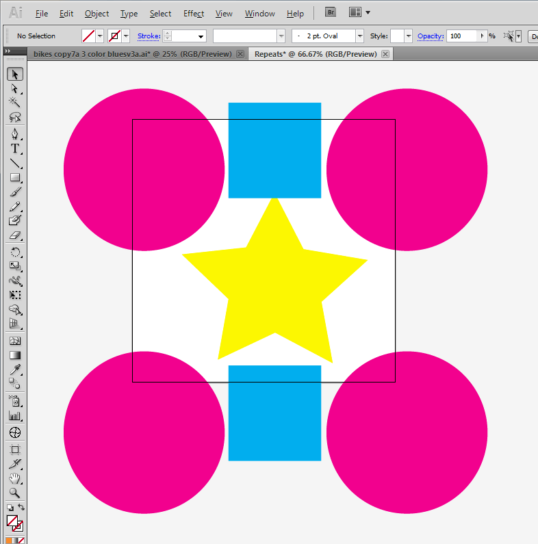 The pink circle and the blue square go outside the repeat bounds, so they need to be duplicated on the other side of the repeat. Precise placement of the duplicates is key to making the repeat seamless. Before moving any objects, make sure you know the exact size of your artboard.