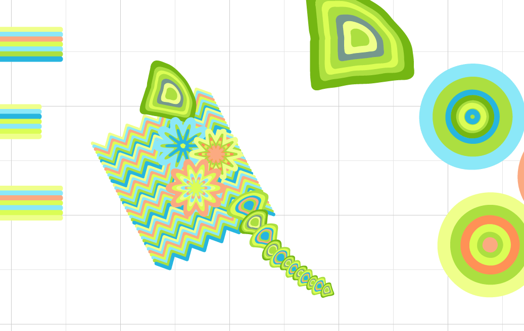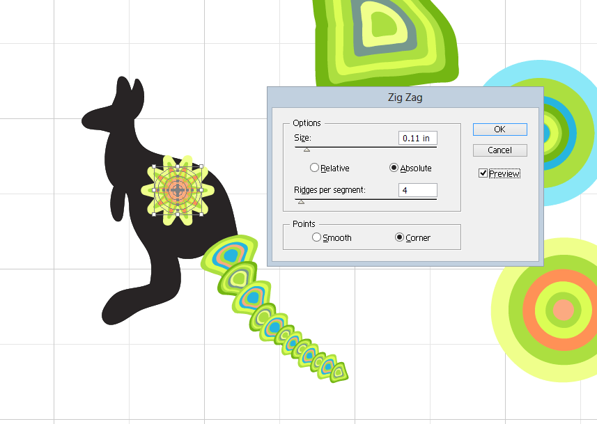 One of the effects I used a lot was the zig zag effect (using the command Effect ==> Distort and Transform ==> Zig Zag). This effect creates flowers out of the circles, and wavy lines from the stripes.