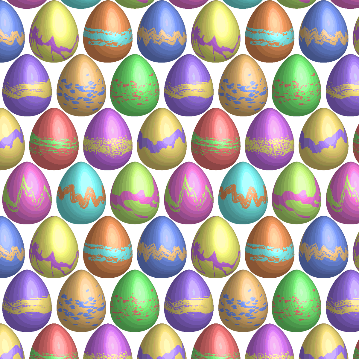 I had a problem with the image resolution when using my fabric designs for the eggs. The contest called for an 8 by 8 inch design, so I was trying to make my eggs about 1 inch high. However, when I applied the designs to the eggs, the resolution was pretty poor. So I opted for a simpler approach. I created solid-color eggs and then mapped a ‘brush stroke’ of another color onto the eggs.