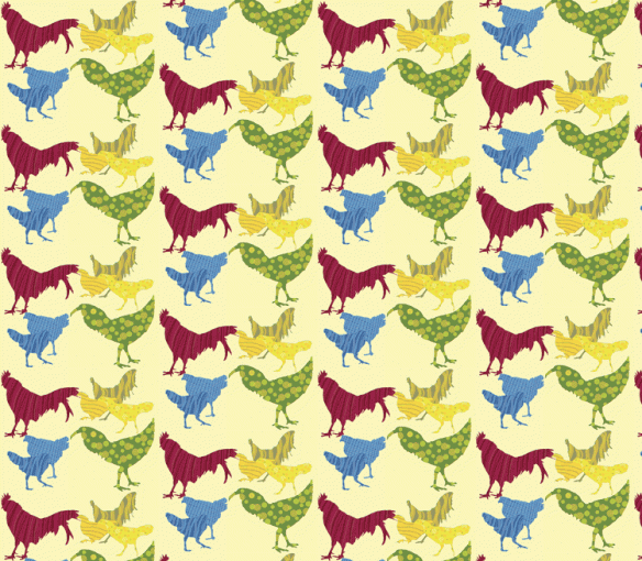 Here’s an example where I recently used a half-drop repeat. Starting with the crazy Kauai rooster photos from the previous post, I removed the background and hand colored the birds in funky colors. I call this Kauai Breakfast because it reminds me of breakfast on the beach in Kauai, surrounded by roosters and hens.