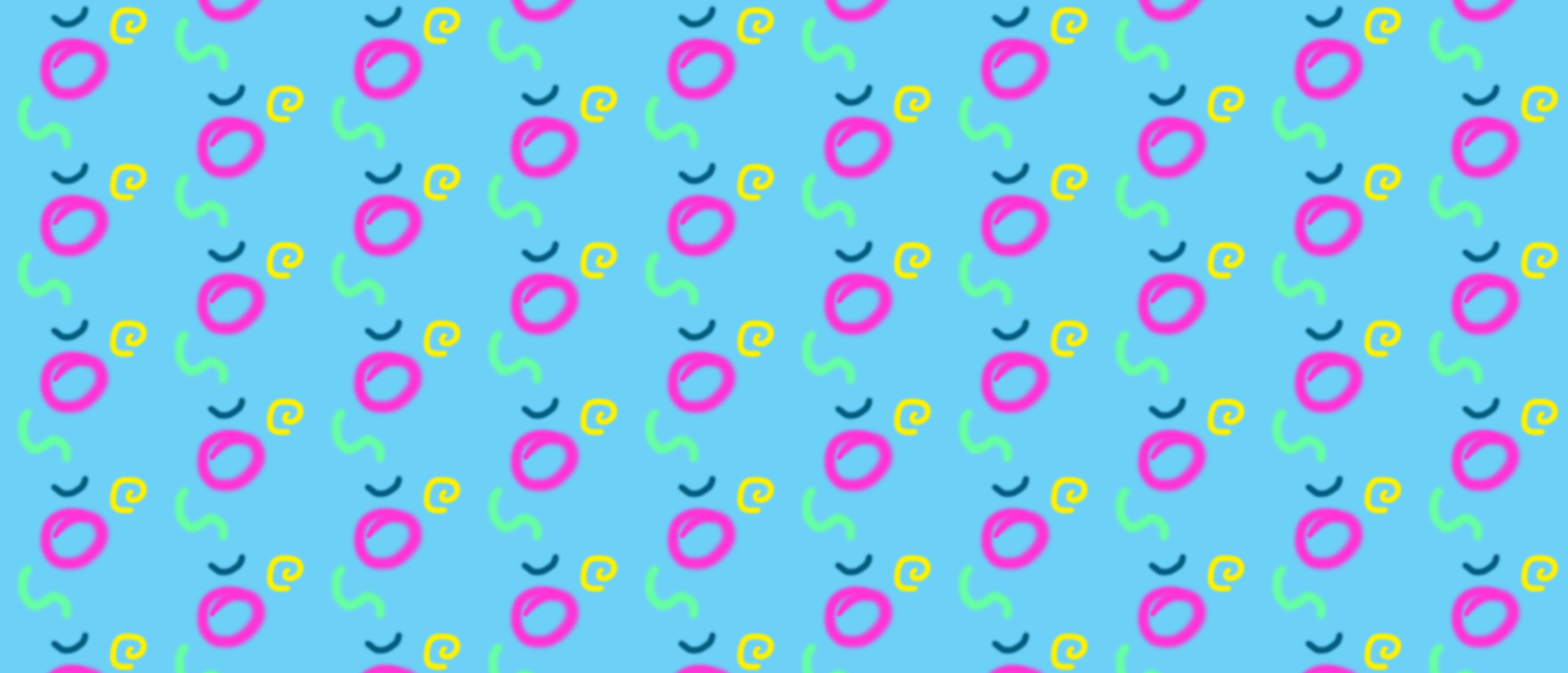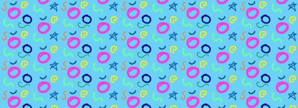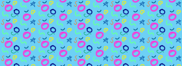 5. One of the fun things you can do is add designs to the tile created in step 3. Here I’ve drawn in some additional elements. When I put this tile into a repeat, the new elements will repeat in a straight repeat while the original elements are in a half-drop repeat (compare the repeat of the blue star to the pink circle). The repeat is shown below.