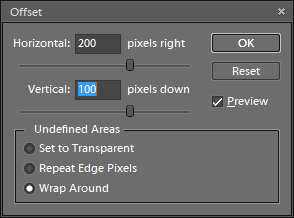3. Next, duplicate the layer (from the menu: Layer –> Duplicate Layer), and then offset this new layer. From the menu: Filter –> Other –> Offset. For the horizontal offset, enter the full width of your original tile (200 pixels for my tile). For the vertical offset, enter half of the original height of your tile (100 pixels in my example). Shown below is the Offset dialog box and then the resulting tile.