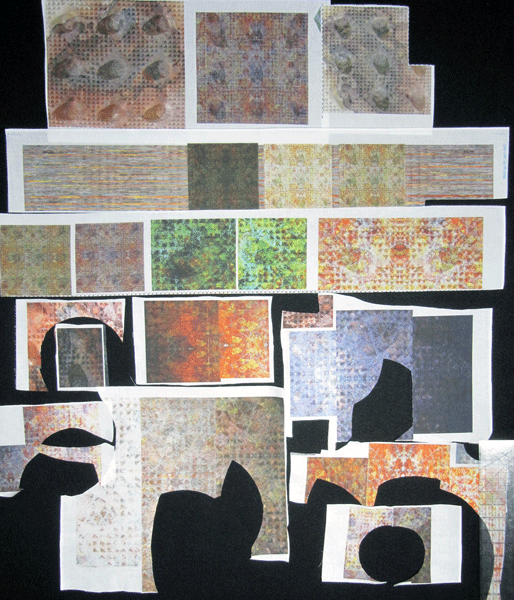 raw) and then sewed it together using blue gradations of my hand-dyed cottons for the water and rust-dyed cotton/silk for the oil. Here’s a picture after it’s all been pieced. At about this point, I decided that I wanted to enter this into the Paducah AQS contest. However, when I looked up the rules, I found that the quilt would need to be at least 40 inches wide and 40 inches high, and this quilt top was only 36 inches square–I was in a bit of a panic. It was a lot of work to piece the top and I certainly didn’t want to start all over. I took a photo of the top and started playing with options in Photoshop. Below are some of the options — a black border (too stark), a dark blue border (better, but not great, and I wasn’t sure if I could get the right color blue), and a border of the rust fabric (OK, but still not great).