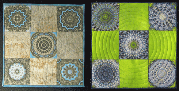 Here are a couple small nine patch quilts using kaleidoscopic images. The one one the left is kaleidoscopes made from a photo of the Tribune Tower in Chicago. The one on the right was made from a photo of a thistle flower.