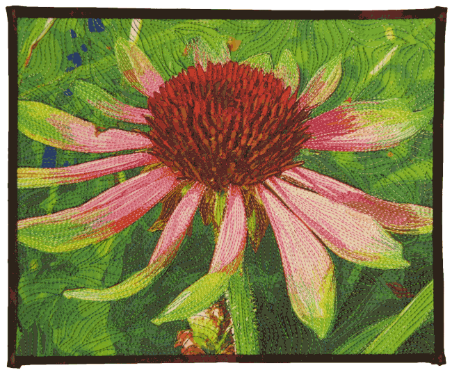 My mother was an avid gardener, a writer of gardening books and an award-winning photographer. While I didn’t inherit her gardening talents, I did start taking photographs at a young age. This quilt started from a photo that I took of a somewhat motley coneflower in my back yard. I edited the photo to remove some of the detail, then I had printed it fabric and added lots of quilting.