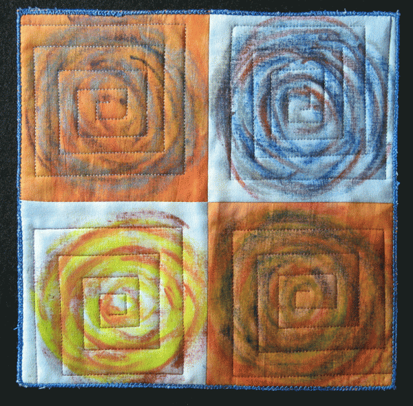 Eccentric Circles Published January 20, 2011 at 600 × 589 in AAQI Quilts Eccentric Circles 8.75″ by 8.75″. Paintstiks on hand-dyed fabric.