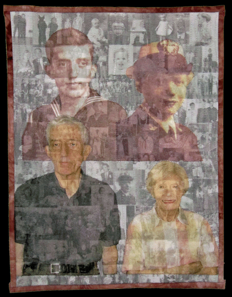 My parents both suffered from Alzheimer’s. This quilt portrays them as young adults when they each served in the Navy in World War II, and as older adults after Alzheimer’s had started to rob them of their memories. The fabric in the quilt is made from photos taken over the course of their lives — representing all the memories that faded as Alzheimer’s progressed. The back of the quilt shows the photos which make up the montage.