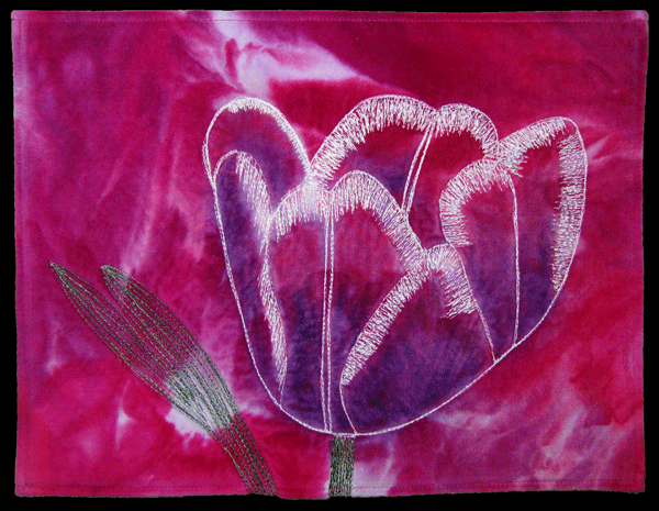 One Tulip Published January 22, 2011 at 600 × 465 in AAQI Quilts One Tulip 11.75″ by 8.75″. Completed in 2010. Whole cloth, hand-dyed velvet, embellished with paint sticks.