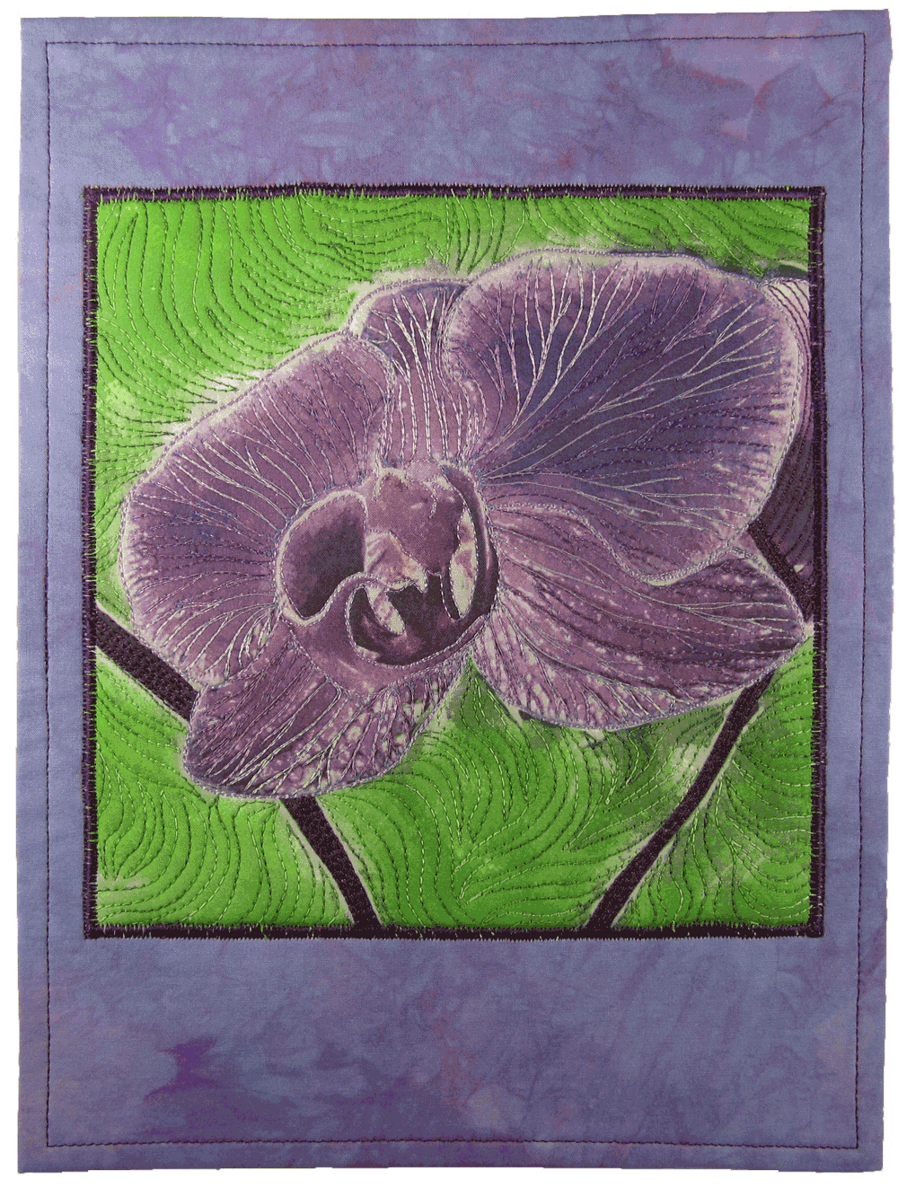 Purple Orchid is from a photo of an orchid that I bought at Home Depot for about $10 several years ago. It bloomed spectacularly for quite a while, but it’s been dormant for a couple years now. Guess it might be permanently dormant at this point… I finished the quilt by printing the photo on fabric and then adding a lot of thread painting.