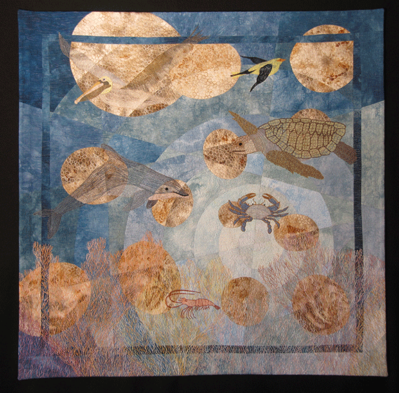 Oil and Water Don’t Mix is part of the “Art and Science” exhibit by the Professional Art Quilt Alliance. Exhibit dates and locations will soon be available here.