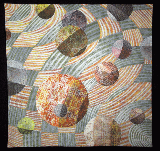 All the fabric was designed specifically for this quilt. For example, the stripes were bent to follow the curves in the pieces. The fabric is based on a single photo of a sidewalk ramp taken during a walk with an unruly puppy named Sparky. Additional views of the fabric can be seen in the “Fabric Designs” section.