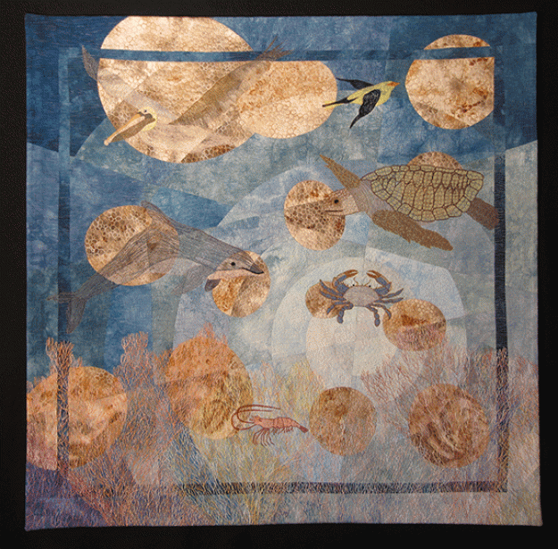 This quilt is in response to the Gulf Oil spill disaster and its impact on all the animals living in the Gulf of Mexico.