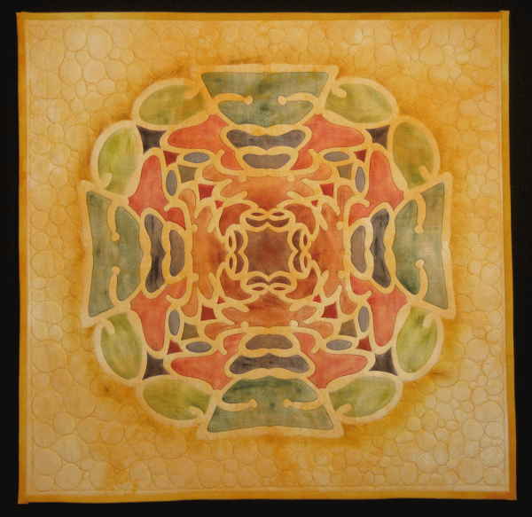 Lily Claire Published January 20, 2011 at 600 × 583 in Small Quilts Lily Claire 20″ by 20″. 2010. Paintstiks applied over hand-dyed fabric using a stencil.
