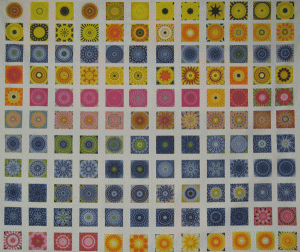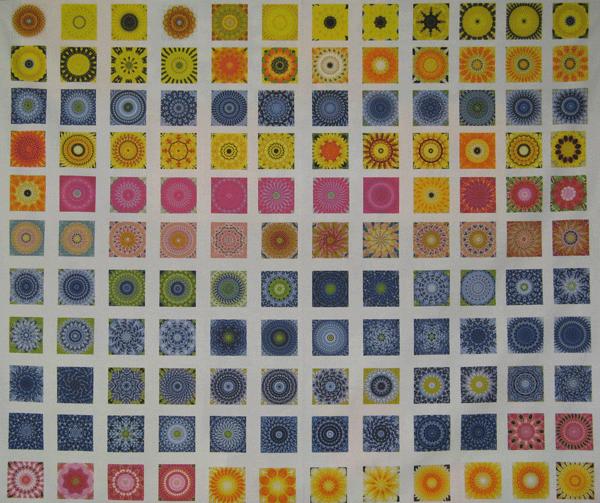 With all the fun I had making kaleidoscopes from photos, I designed another yard of fabric, this time with 132 different 2.5 inch square kaleidoscopes, made using flower photos I’d taken.