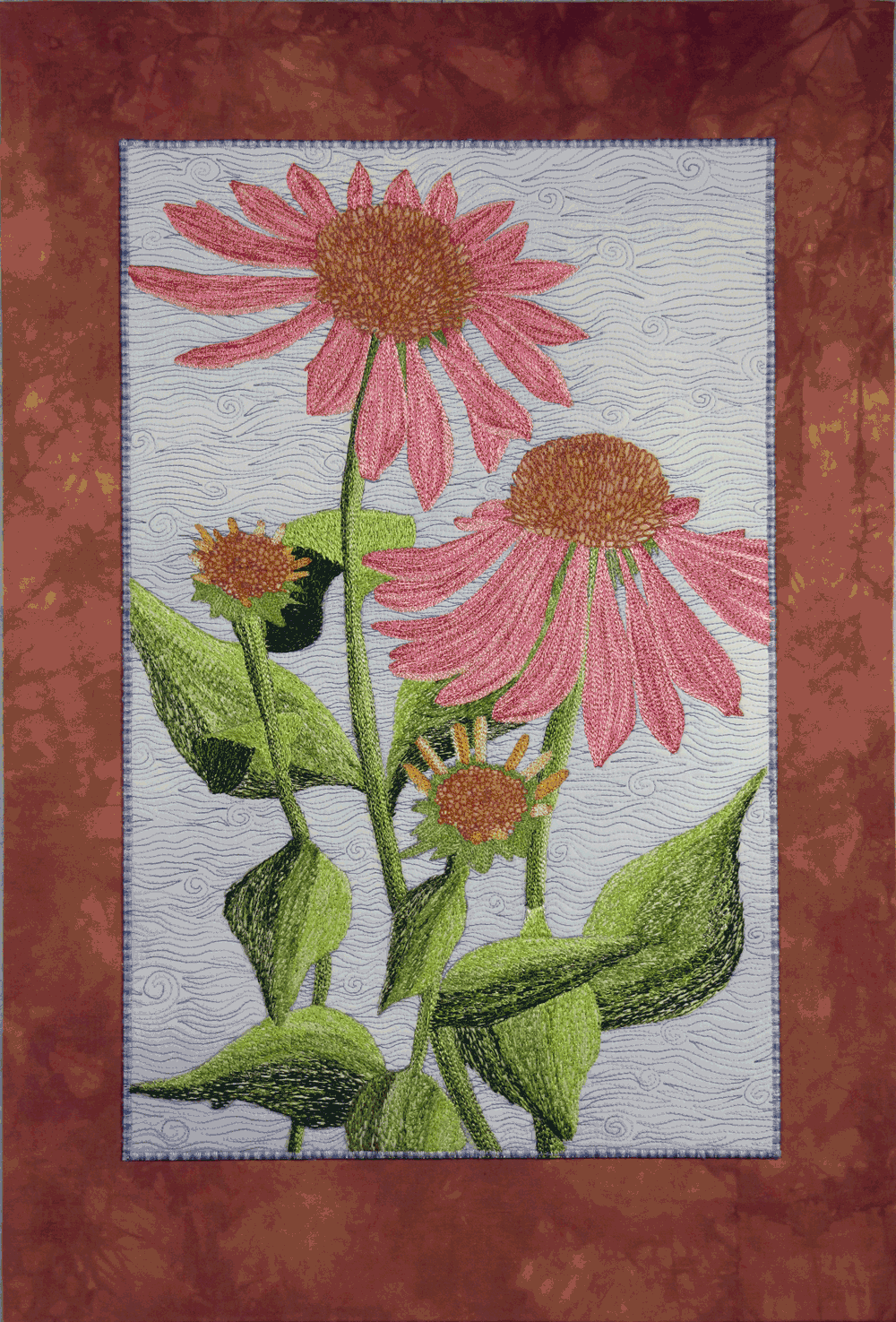 Here’s the finished quilt, Coneflowers. It’s 17 inches wide by 25 inches long.
