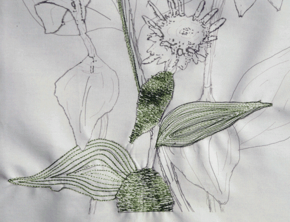 Before starting with the thread, I backed this with an ultra-firm stabilizer (peltex #72) and a backing layer of fabric. I started the thread painting on the stems, and kept it fairly light, but when I got to the leaves, the thread started building up pretty heavily.