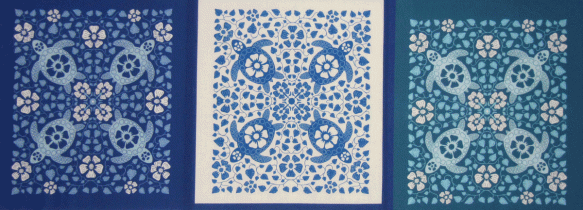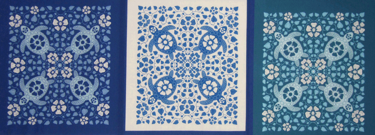 I previously wrote about a Hawaiian Cheater Quilt design that I did for a contest at Spoonflower. I ordered a yard of the fabric on which I included a large version of the design and three small versions (about 8 inches by 10 inches) in different colors. Here are the smaller versions.